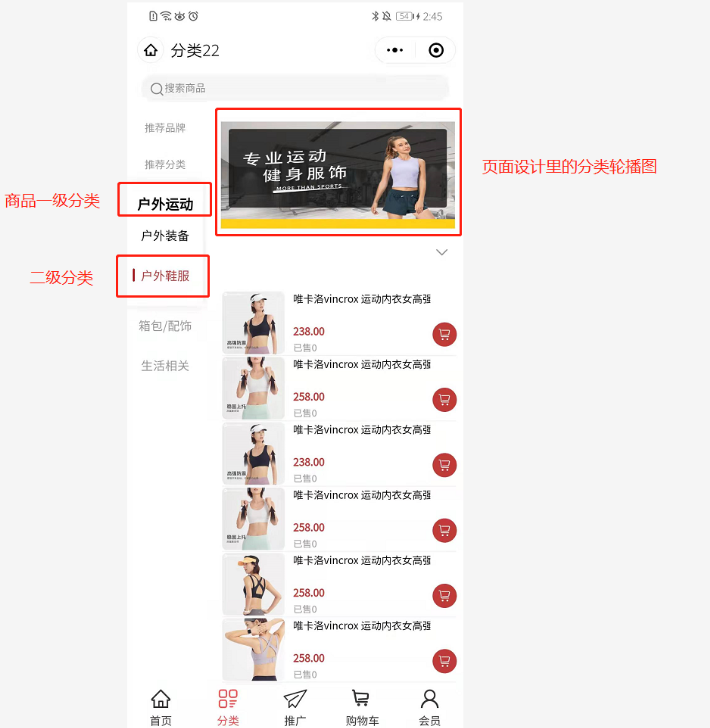 通过在分类项的顶部展示图片,将流量引到相关商品,完成订单转化达成营销目的。
